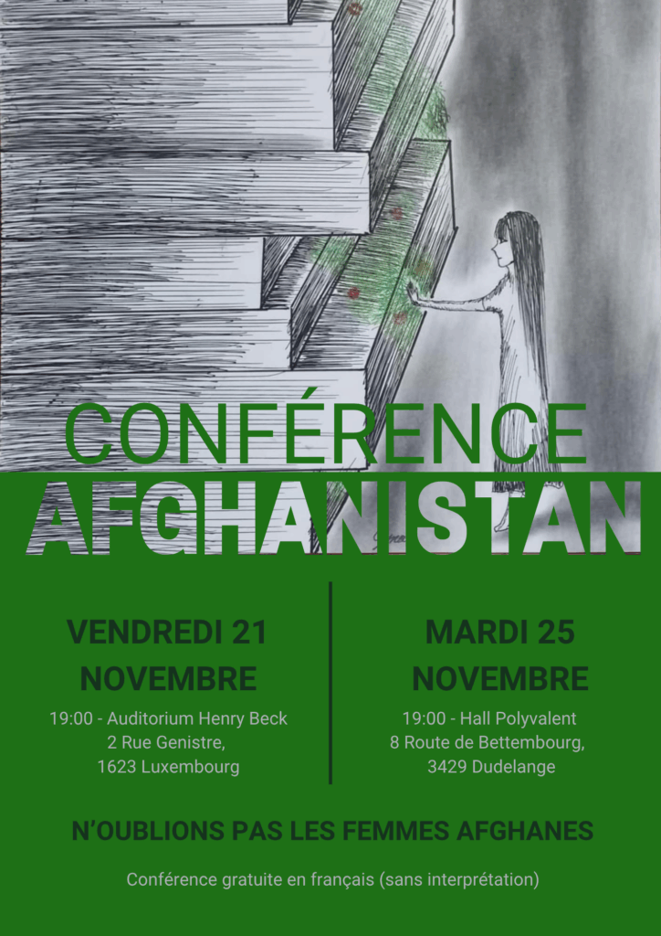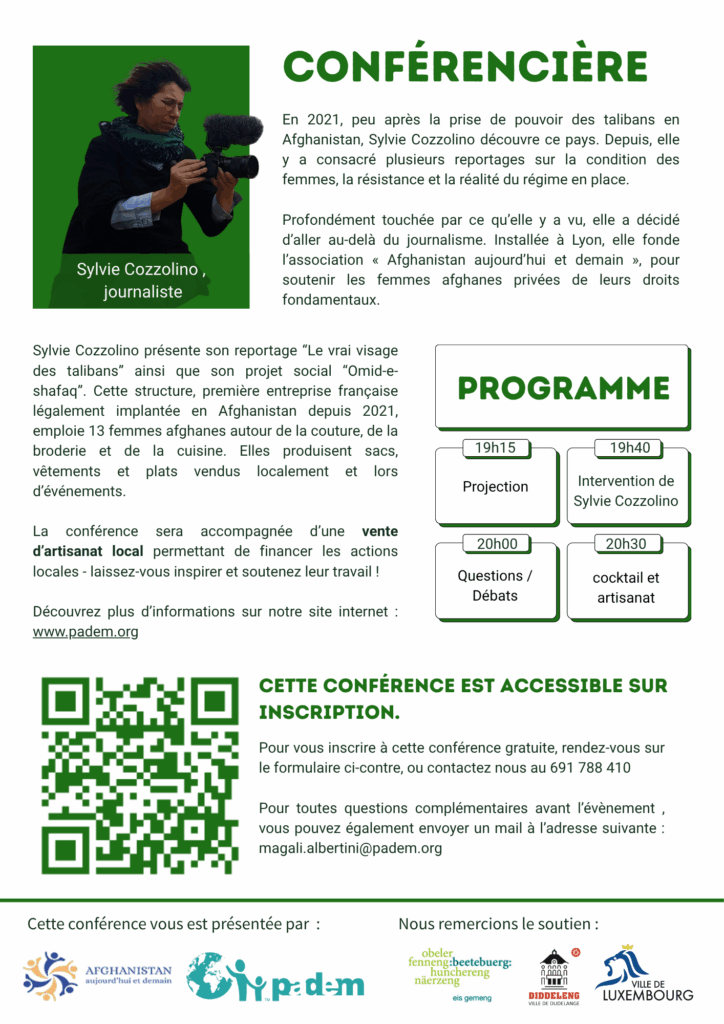 L’ONG PADEM (Programmes d’Aide et de Développement destinés aux Enfants du Monde) organise, en collaboration avec l’association AFGHAAD (Afghanistan aujourd’hui et demain), et en partenariat avec la Ville de Luxembourg & la Commune de Dudelange en partenariat avec La Ville de Bettembourg, deux conférences « N’oublions pas les femmes afghanes ».
